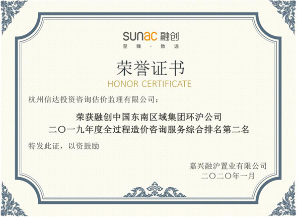 融創(chuàng)中國東南區(qū)域集團(tuán)環(huán)滬公司2019年度全過程造價咨詢服務(wù)綜合排名第二名