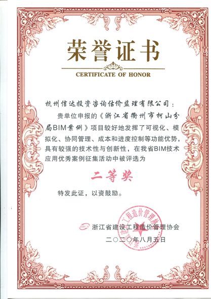 浙江省建設(shè)工程造價管理協(xié)會“BIM優(yōu)秀案例二等獎”